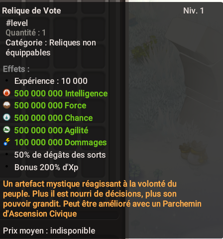 La relique de vote est une <mark style="color:red;">**relique évolutive**</mark> qui va nécessiter l'utilisation de parchemin pour monter en expérience.