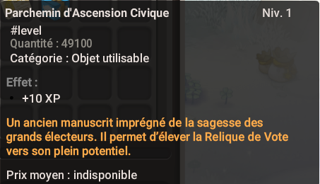 3. Utilisez les  '<mark style="color:purple;">**Parchemin d'Ascension Civique**</mark>'  pour monter le niveau de votre relique